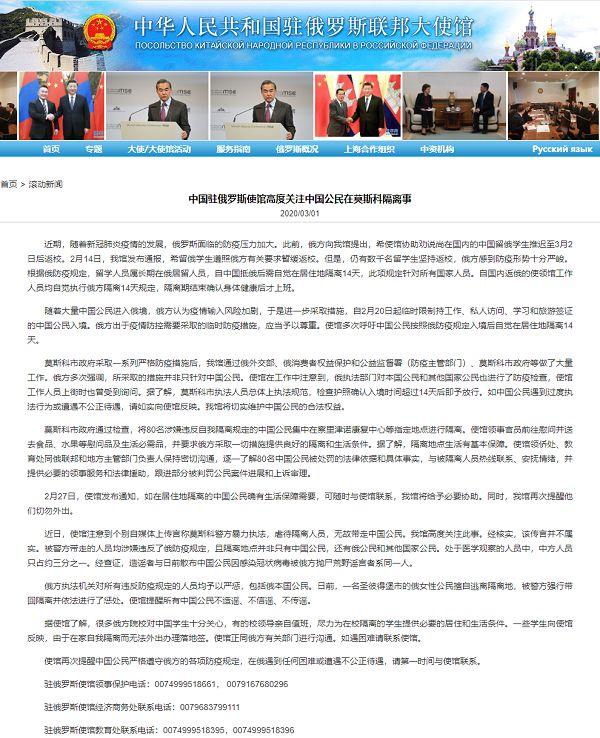近日,使馆注意到个别自媒体上传言称莫斯科警方暴力执法,虐待隔离人员,无故带走中国公民。我馆高度关注此事。经核实,该传言并不属实。被警方带走的人员均涉嫌违反了俄防疫规定,且隔离地点并非只有中国公民,还有俄公民和其他国家公民。处于医学观察的人员中,中方人员只占约三分之一。经查证,造谣者与日前散布中国公民因感染冠状病毒被俄方抛尸荒野谣言者系同一人。