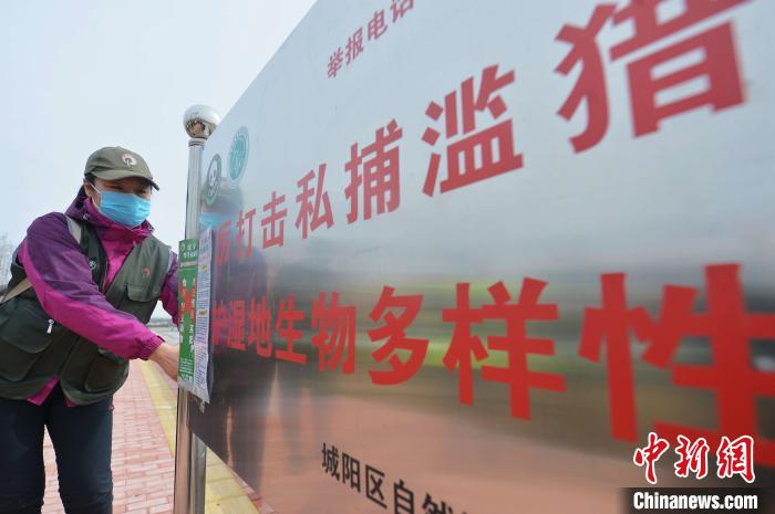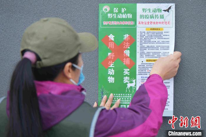 青岛市城阳区野生动植物保护协会的志愿者来到社区、菜市场附近张贴“禁食野味”海报。 王海滨 摄