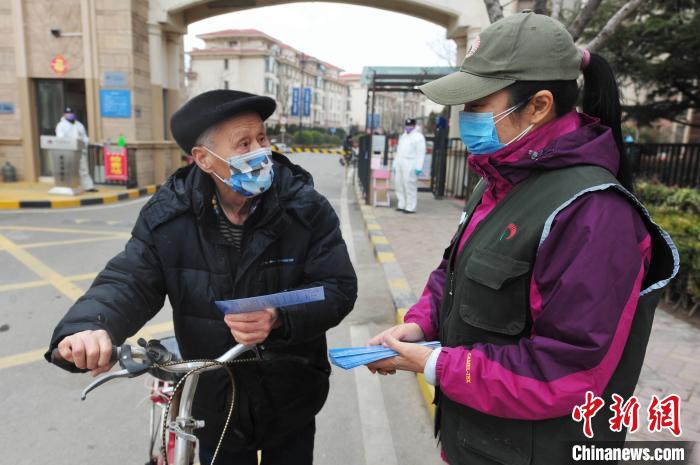 志愿者向社区居民发送“禁食野味”宣传单。 王海滨 摄
