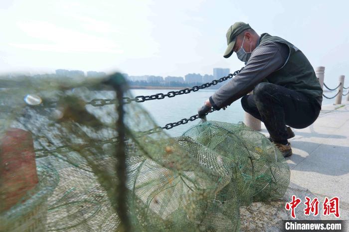 志愿者对清理的地笼网做无害化处理。 王海滨 摄