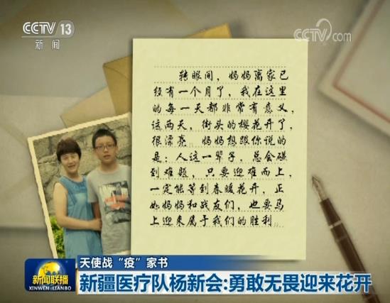央视网消息(新闻联播):新疆第二批支援湖北医疗队102人当中有91名女性,杨新会是他们的副领队,她在儿子生日前夕写下的一封家书,既记录下了将近一个月奋战在方舱内的感悟,也寄托了自己对儿子成长的期许。