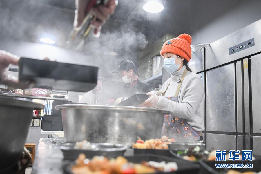 2月26日,“雨衣妹妹”(右)在分装盒饭。 新华社记者 程敏 摄