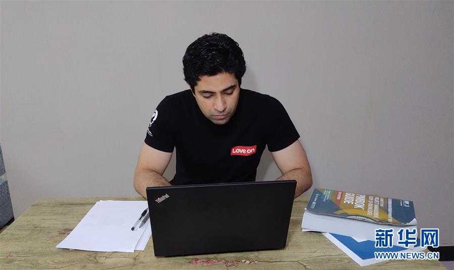巴基斯坦籍志愿者哈荣在和他的团队联络(资料照片)。 新华社发