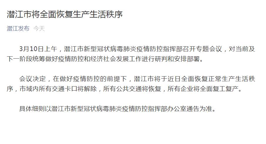 会议决定,在做好疫情防控的前提下,潜江市将于近日全面恢复正常生产生活秩序,市域内所有交通卡口将解除,所有公共交通将恢复,所有企业将全面复工复产。