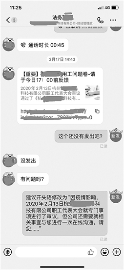 2月17日下午3点,由公司技术部门编写的“公司用工调查问卷”小程序向全体员工推送,要求各部门督促员工在线提交是否同意变更工资支付日的意见。同时,由人力资源部门和工会向提出异议的员工提供在线答疑协商,争取员工谅解同意。