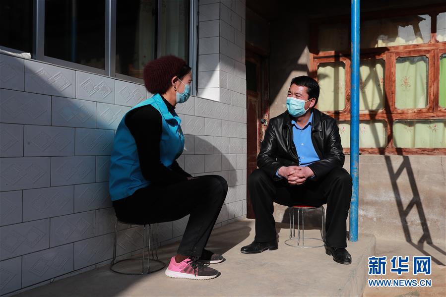 3月10日,全国人大代表、临夏回族自治州广河县庄窠集镇西坪村党支部书记马天龙(右)在一户村民家了解村民生产生活情况。新华社发(杜哲宇 摄)