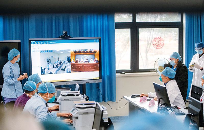 2020年2月11日,广东医疗队武汉前方ICU团队在武汉协和医院西院与后方广州医科大学附属第一医院专家举行远程视频会诊。 新华社记者 肖艺九/摄