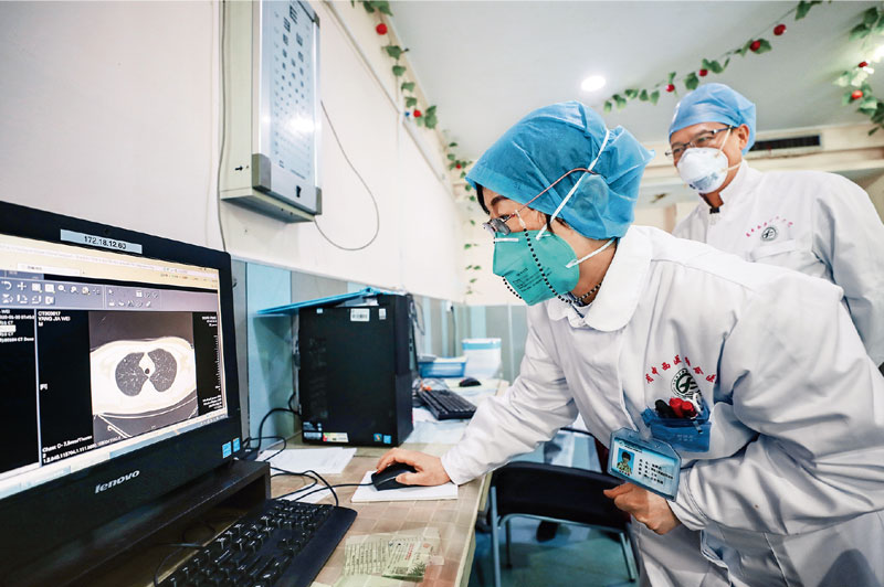 湖北省中西医结合医院呼吸内科主任张继先,把党和人民的利益放在首位,是医院救治一线的“带头人”。图为2020年1月30日张继先在查看病人肺部的CT影像。长江日报记者 陈卓/摄