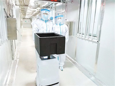 医疗机器人“小珈”正式进入雷神山医院后,要承担送药送饭等系列工作。图为武汉大学中南医院医生杨琨(左)与护士胡慧在病房前与小珈在一起。