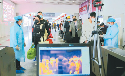 2月11日,广西钦州东站乘客接受红外热成像测温仪检测体温。