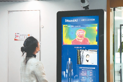 3月16日,北京市海淀区中关村前沿技术创新中心内的AI红外测温仪。