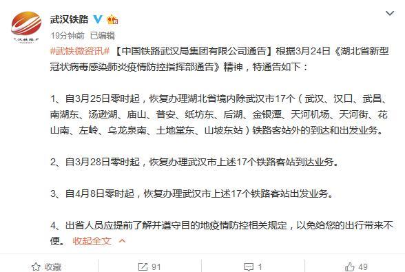 通告明确,自3月28日零时起,恢复办理武汉市17个(武汉、汉口、武昌、南湖东、汤逊湖、庙山、普安、纸坊东、后湖、金银潭、天河机场、天河街、花山南、左岭、乌龙泉南、土地堂东、山坡东站)铁路客站到达业务。自4月8日零时起,恢复办理武汉市上述17个铁路客站出发业务。