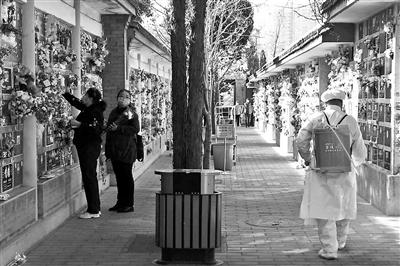昨天上午8时,八宝山革命公墓骨灰堂礼仪组的郝晓、王路斌带着祭扫工具和鲜花,前往预约代祭扫的墓位为逝者服务。