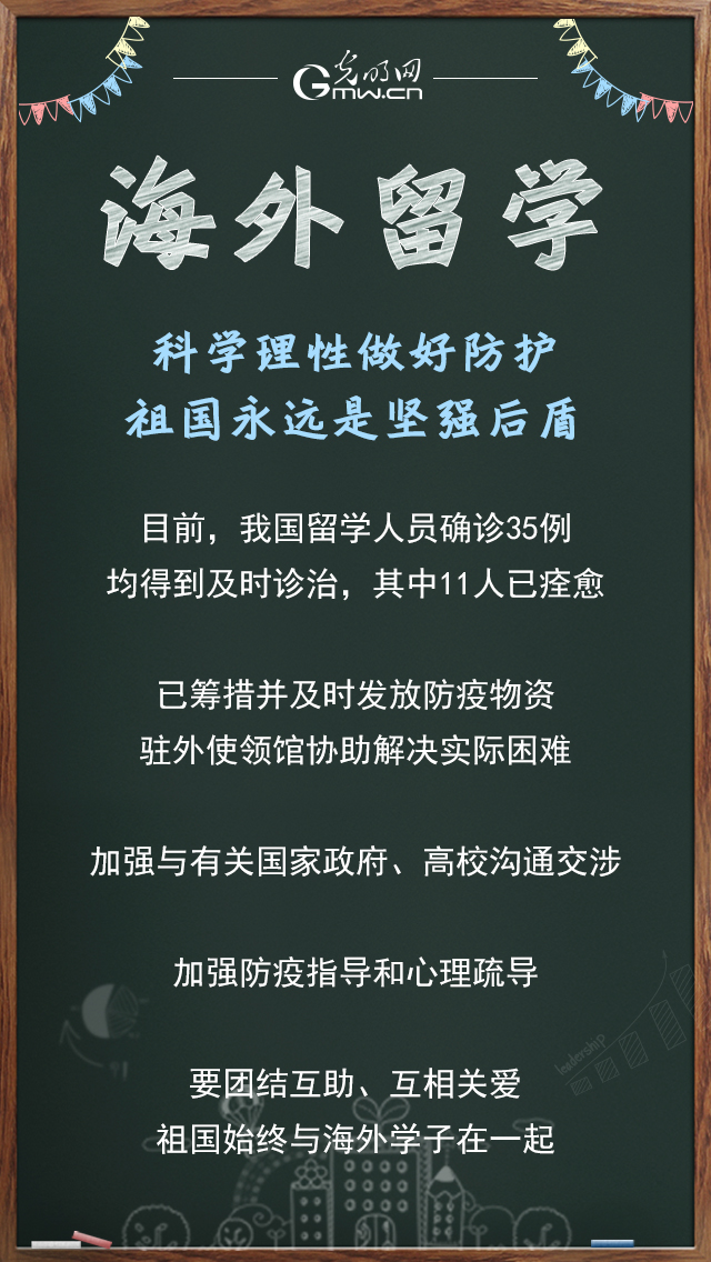 教育部国际合作与交流司司长、港澳台办公室主任刘锦介绍,我国海外留学人员总数约160万人,仍在国外的约142万人,目前有确诊病例35例,均得到及时诊治,其中11人已经痊愈。对确诊的留学人员,驻外使领馆第一时间提供领事保护,积极协助在当地就医。同时,敦促外国政府和高校公正对待我国留学人员,给予尊重和人文关怀。