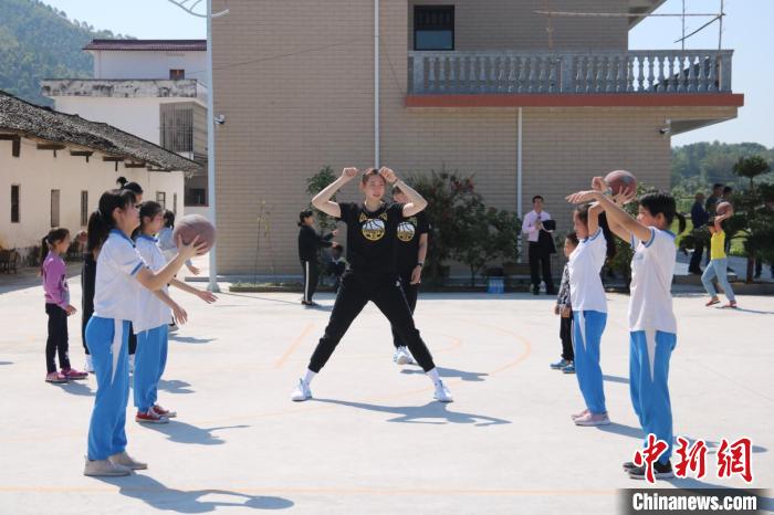 广东女子篮球队代表给廊田村青少年进行篮球基本教学。共青团广东省委 供图