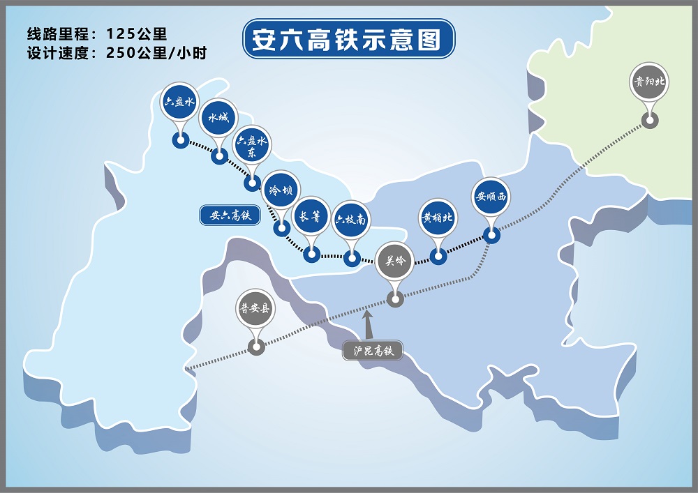 安六高铁是贵州省首条时速250公里的城际铁路,为沪昆高铁的延伸和补充,也是贵州省快速城际铁路网的重要组成部分。通过沪昆高铁连接起了贵阳、安顺、六盘水三个重要城市,沿线旅游资源丰富,民族风情浓郁,历史文化灿烂。安六高铁的开通运营,使六盘水市全面接入全国高铁网,加快融入贵阳1小时经济圈,对于合理引导沿线地区城镇空间布局,促进区域经济交流和旅游业发展,坚决打赢西部地区脱贫攻坚战具有重要意义。