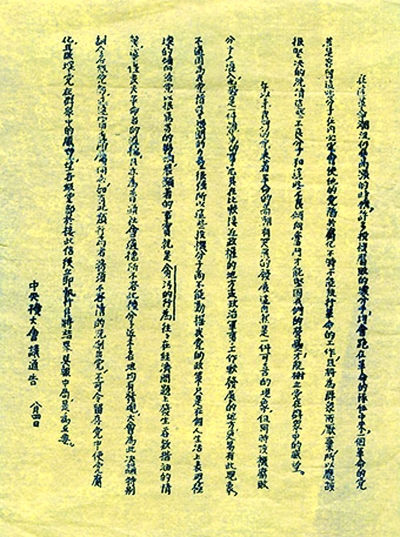 “在这革命潮流仍在高涨的时候,许多投机腐败的坏分子,均会跑在革命的队伍中来,一个革命的党若是容留这些分子在内,必定会使他的党陷于腐化……这些投机分子尚不能动摇我党的政策,只是在个人生活上表现极坏的倾向,给党以很恶劣的影响,最显著的事实,就是贪污的行为,往往在经济问题上发生吞款、揩油的情弊。这不仅丧失革命者的道德,且亦为普通社会道德所不容。此种分子近来各地均有发现,大会为此决议特别训令各级党部,迅速审查所属同志,如有此类行为者,务须不容情的洗刷出党,不可令留存党中,使党腐化,且败坏党在群众中的威望。望各级党部于接此信后,立即执行,并将结果具报中局,是为至要。”