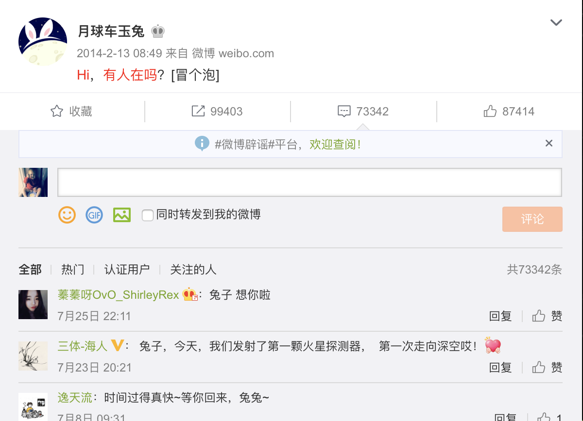 “玉兔”不仅在月球表面完成自己的科研任务,在社交媒体上,一个名为“月球车玉兔”的账号受到热捧。2013年12月1日,在嫦娥三号探测器发射前4小时,这个账号发出了第一条消息“Hi,有人在吗?”。三年过去了,有网友在下面回复“兔子,今天我们发射了第一颗火星探测器,第一次走向深空哎!”。如今依然有人对它说:“兔子,想你啦”。月球车玉兔的首秀,收获了7万条留言,10万次转发。