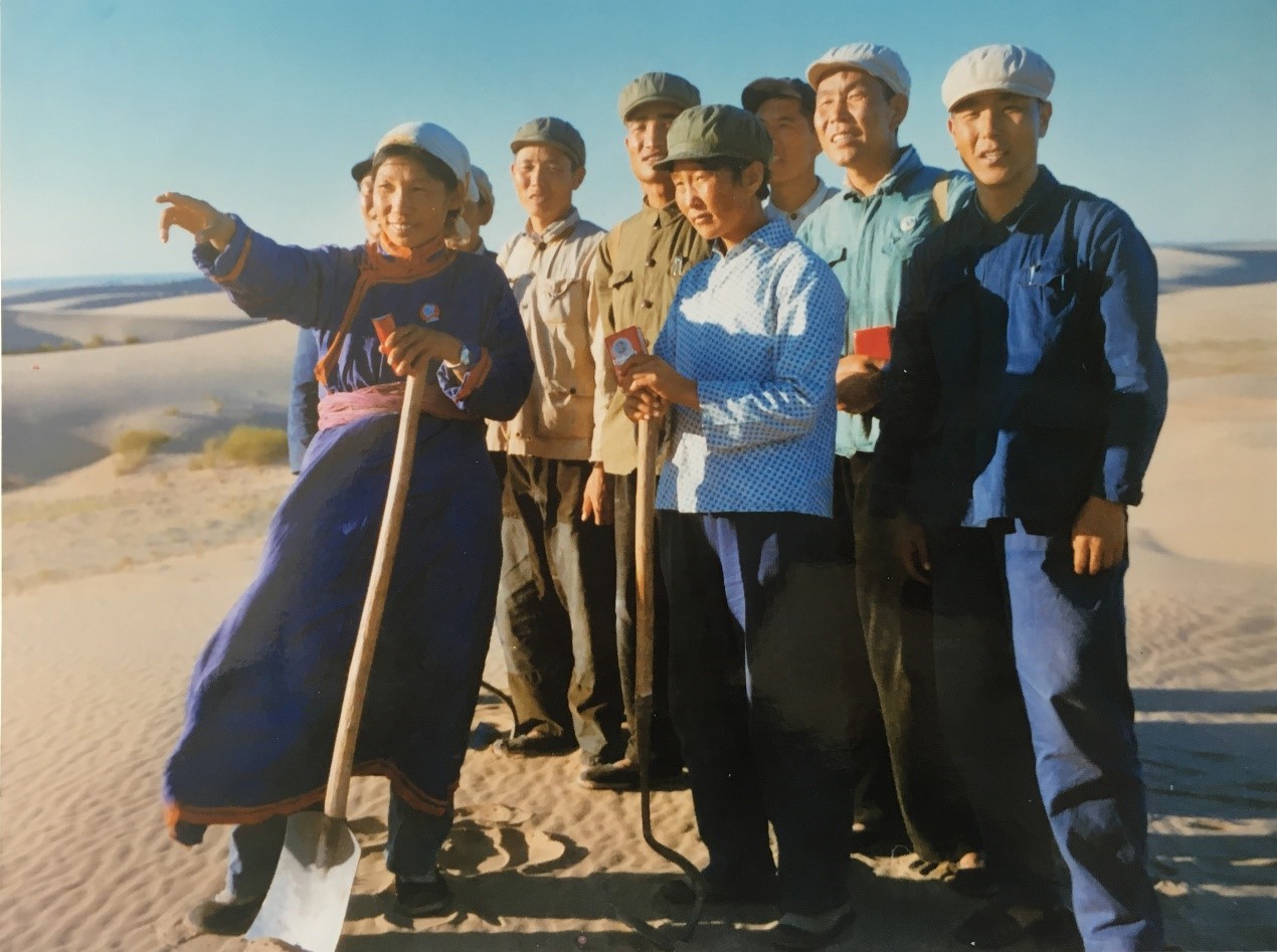 宝日勒岱(左一)带领农牧民治沙植绿。(乌审旗宣传部供图)