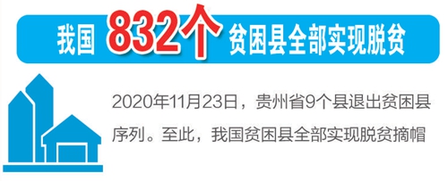 2020年11月23日,贵州省人民政府宣布,紫云县、纳雍县、威宁县、赫章县、沿河县、榕江县、从江县、晴隆县、望谟县9个县全部退出贫困县序列。至此,全国832个贫困县全部实现脱贫摘帽。