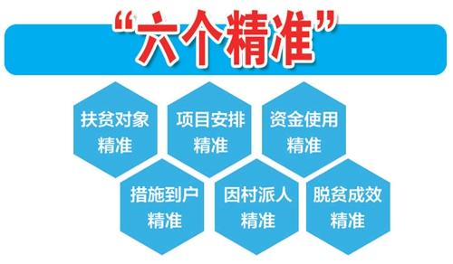 “六个精准”是指扶贫对象精准、项目安排精准、资金使用精准、措施到户精准、因村派人(第一书记)精准、脱贫成效精准。2020年实现贫困人口如期脱贫、贫困县全部摘帽,靠的就是实施精准扶贫、精准脱贫基本方略,改革现行扶贫思路和方式,变大水漫灌为精准滴灌,变“输血”为“造血”,变重GDP为重脱贫成效。