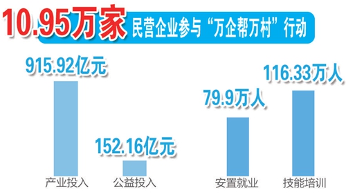 2015年10月,“万企帮万村”行动启动。截至2020年6月底,参与“万企帮万村”精准扶贫行动台账管理的民营企业10.95万家,帮扶12.71万个村;产业投入915.92亿元,公益投入152.16亿元,安置就业79.9万人,技能培训116.33万人。