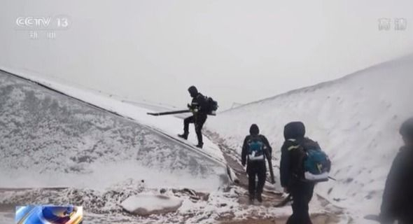 在河南商丘夏邑县北岭镇高效农业产业园内,20余户种植户在农技师的指导下,利用除雪机,对大棚上面的积雪进行清除。这些除雪机,功率大、风力足,四五个人配合作业,20分钟就可以将一座占地10余亩的大棚积雪处理干净。