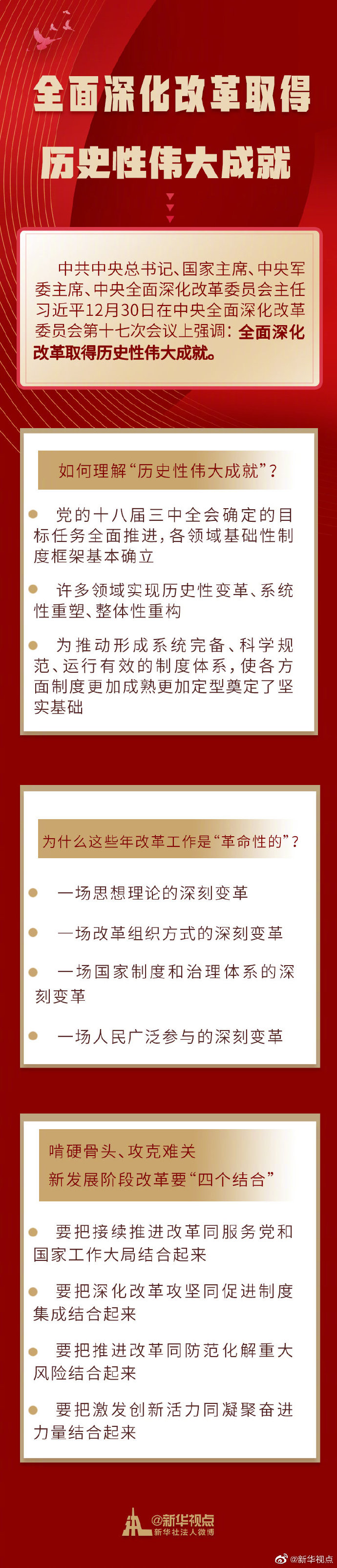 中共中央总书记、国家主席、中央军委主席、中央全面深化改革委员会主任习近平12月30日主持召开中央全面深化改革委员会第十七次会议并发表重要讲话,强调:全面深化改革取得历史性伟大成就。