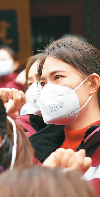 2月7日,四川省第五批援助湖北医疗队出征。图为队员出征前宣誓。王 曦摄(新华社发)