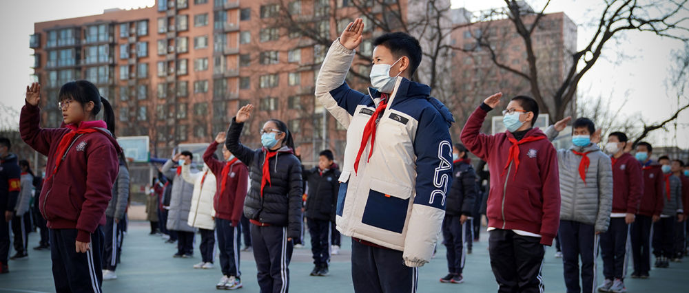 在北京四中广外校区,蔡昊霖(前)和同学一起参加升旗仪式(12月21日摄)。