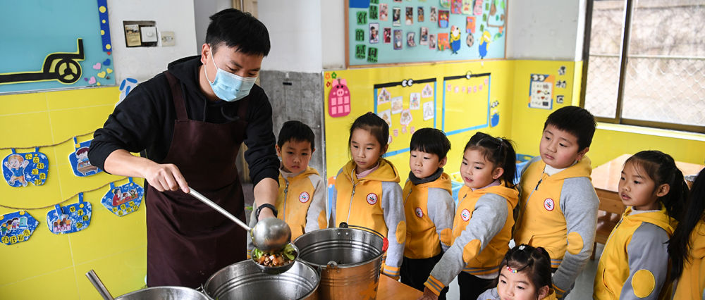 孙浩在合肥钢铁集团第一幼儿园为孩子们打饭菜(12月18日摄)。