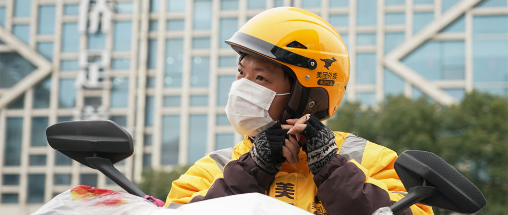 外卖小哥陈凯,戴着口罩,为陌生的人们运送着米面油盐和一日三餐。