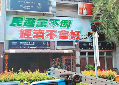 民进党再次执政眼看就满两年,当初震天动地喊着“国民党不倒、台湾不会好”风光上台,哪想到如今却在自己的铁票区高雄市面对“民进党不倒、经济不会好”的大标语。标语非关政治选举,而是挂在高雄知名餐厅“雅宴招待会馆”大门上,店主因生意太清淡被迫关门结业,郁闷难解,自制标语表达心声。
