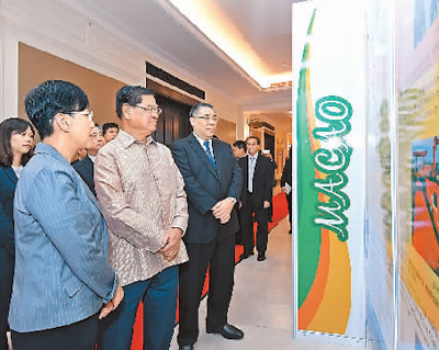 崔世安(左三)和柬埔寨副首相兼内政部大臣韶肯(左二)等参观澳门“一国两制”及“参与‘一带一路’建设”图片展。苏 宁摄