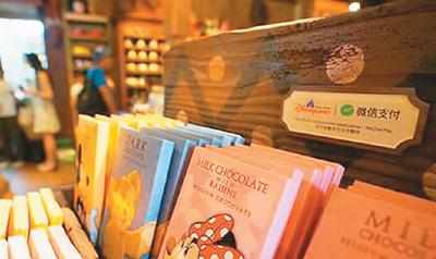 香港迪士尼乐园商店的收银台安放提示牌,提醒顾客可以使用微信支付。