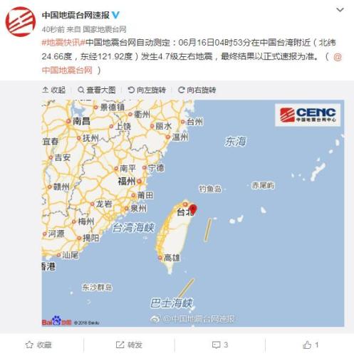 中国台湾附近发生4.7级左右地震