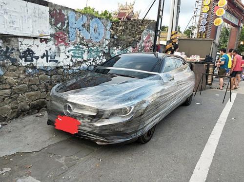 奔驰车疑似妨碍摊贩做生意,遭保鲜膜包覆警告。台湾《联合报》记者蒋继平/翻摄
