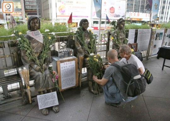 据香港媒体早前报道,3个分别代表中国、韩国及菲律宾少女的慰安妇铜像,已设立在香港中环交易广场行人天桥400天多天,该处邻近日本驻港总领事馆。11日,“保钓人士”曾前往此处献花纪念。(海外网/汪梦唐)