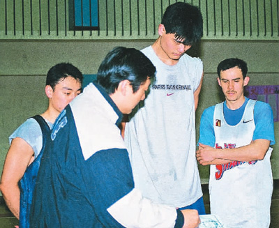 图为李秋平(左二)在赛场上指导郑志龙(右一)和姚明(右二)。(资料图片)