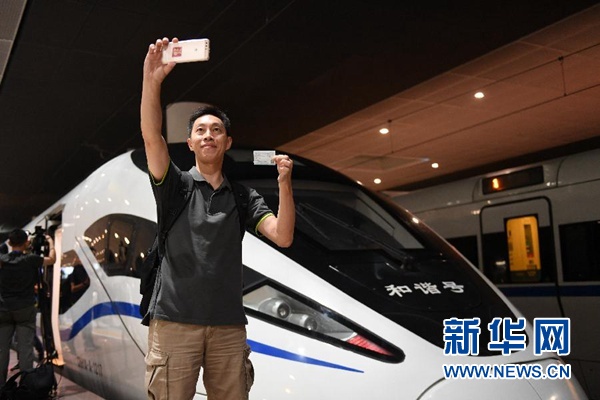 9月23日,搭乘G5711次高铁列车前往香港西九龙站的乘客在深圳北站拍照留念。新华社记者毛思倩摄