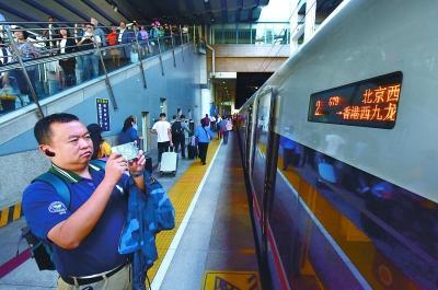 9月23日,搭乘G79次高铁列车前往香港西九龙站的乘客在北京西站拍照留念。记者 和冠欣摄