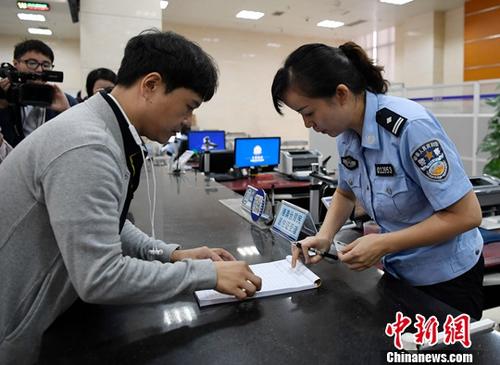 9月13日,成都市公安局温江区分局办证中心,在成都师范学院工作五年的台胞罗天豪从工作人员手中接过台湾居民居住证,这也是四川发出的首张台湾居民居住证。中新社记者 安源 摄