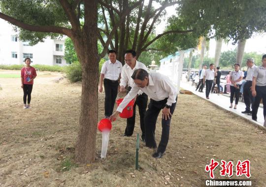 江丙坤为六年前栽的樟树施肥浇水。 严利人 摄