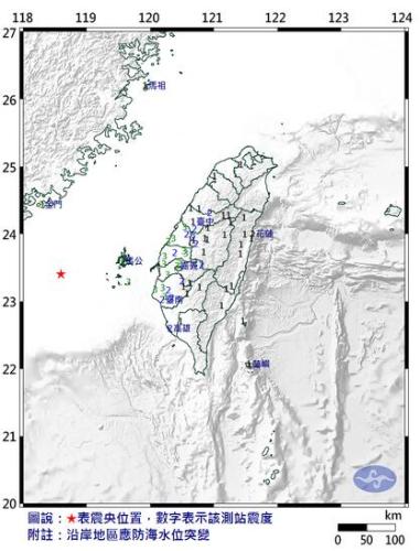 据报道,地震发生在26日早晨约7时57分,震中位于澎湖县政府以西101.9公里,震源深度20.5公里。最大震度为澎湖、金门、台南、云林、嘉义、彰化均3级。