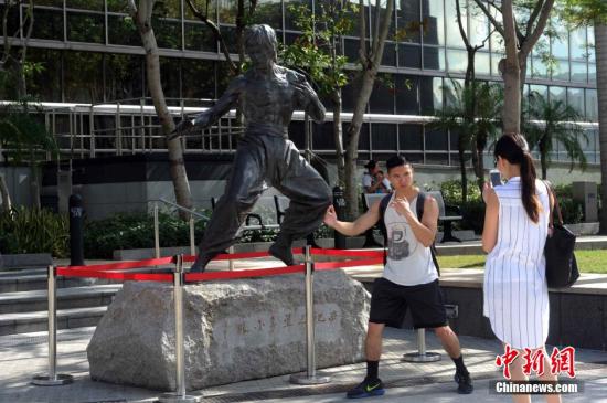 资料图:游客与武打巨星李小龙铜像合照。中新社记者 谭达明 摄