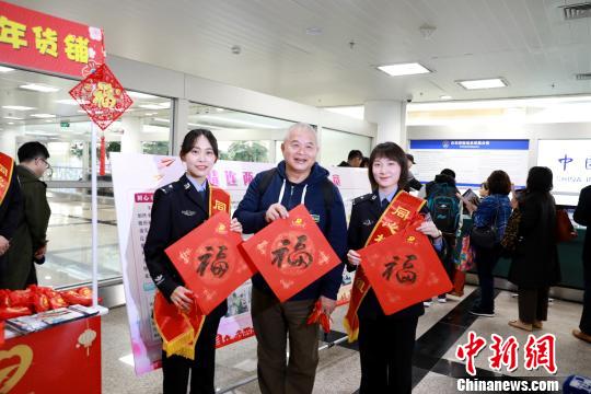 高崎边检站同心桥服务组民警向台湾旅客发放福袋春联等年货,送新春祝福。供图