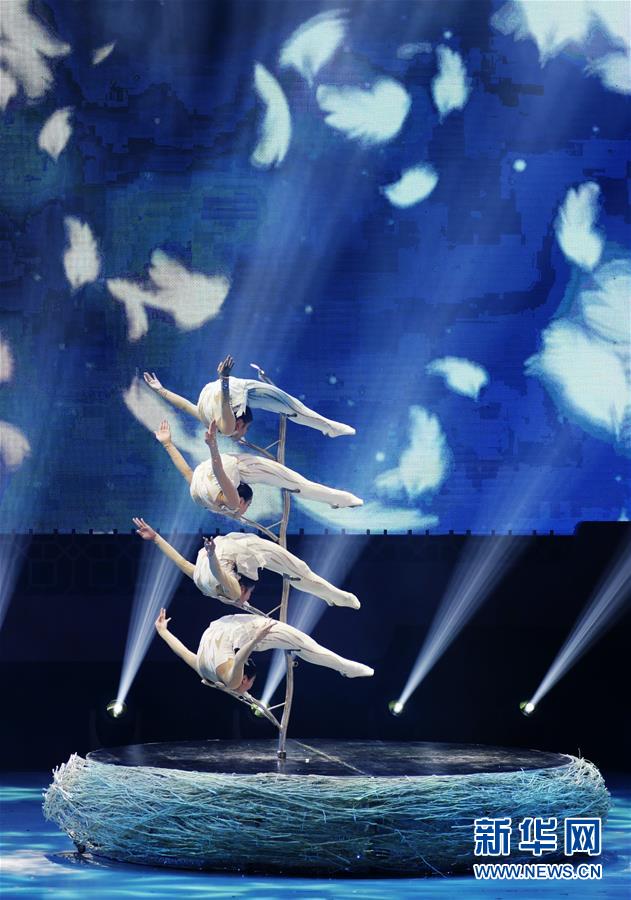 2月18日,演员在表演杂技。 当日,“四海同春”香港各界新春晚会在香港体育馆举行。 新华社发(王申 摄)