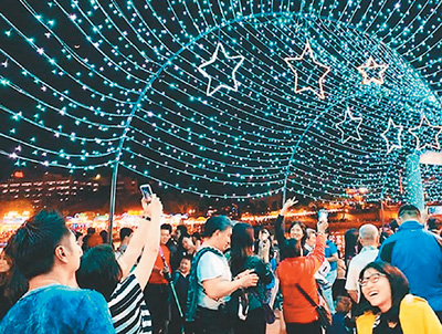 高雄爱河金银河灯会首创数座绚烂百米隧道灯,吸引民众拍照取景。