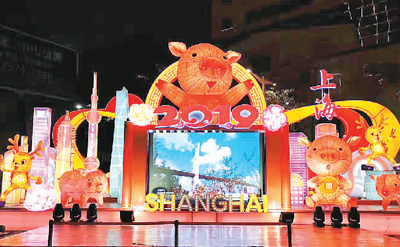 花灯中央的巨幅LED屏幕滚动播放着上海城市文化旅游形象宣传片——《心动上海》和《我们的上海》,展示着上海中心大厦、上海环球金融中心、金茂大厦等天际线以及外滩景色。屏幕上方和周围分布着“喜猪”和上海旅游节吉祥物“小鹿乐乐”,它们憨态可掬,喜气夺人,吸引了许多台北市民驻足、拍照。