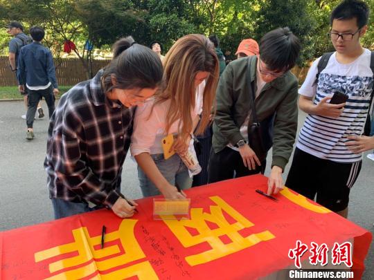 两岸及港澳青年在环保倡议横幅上签字。 郭其钰 摄